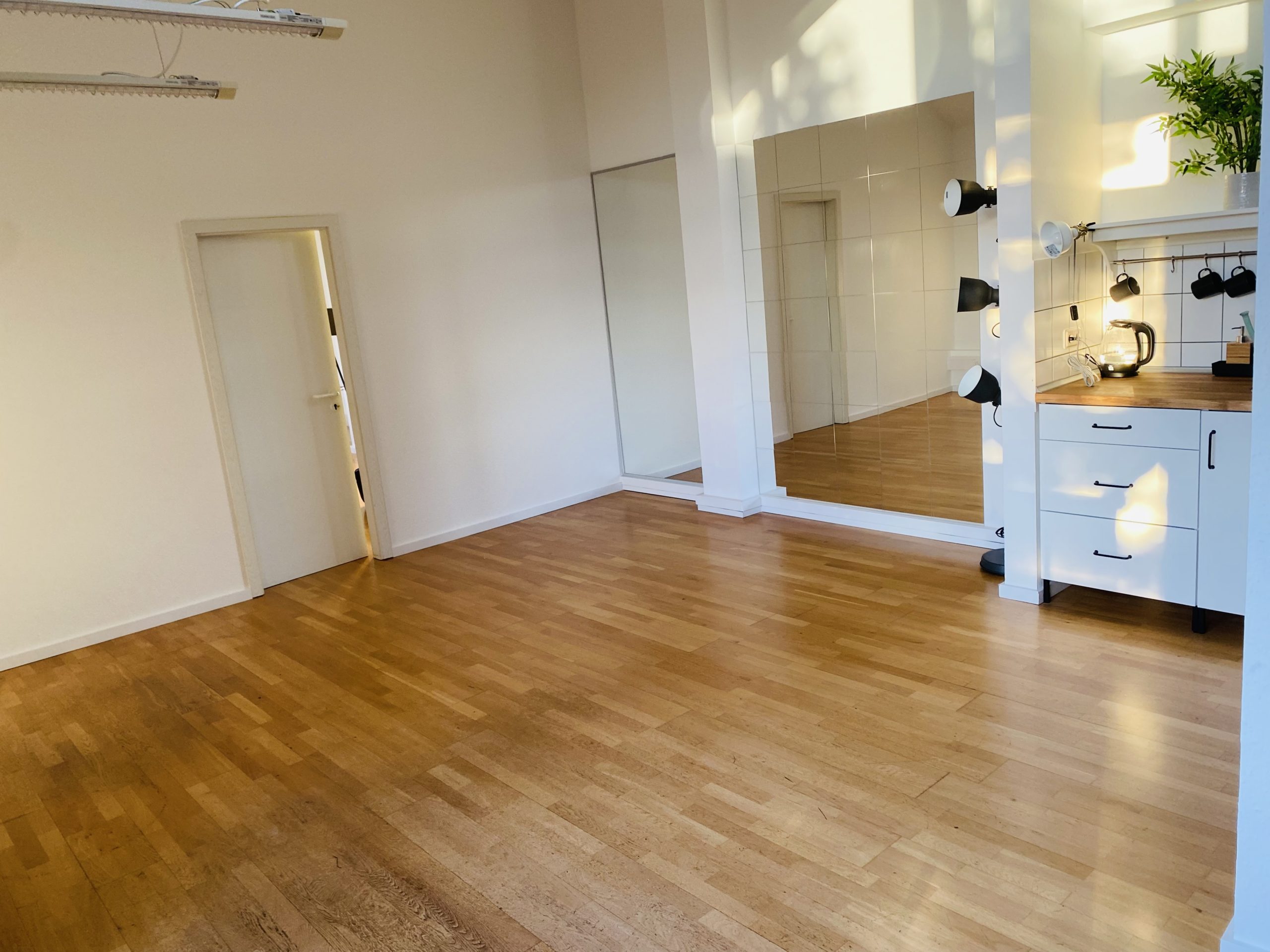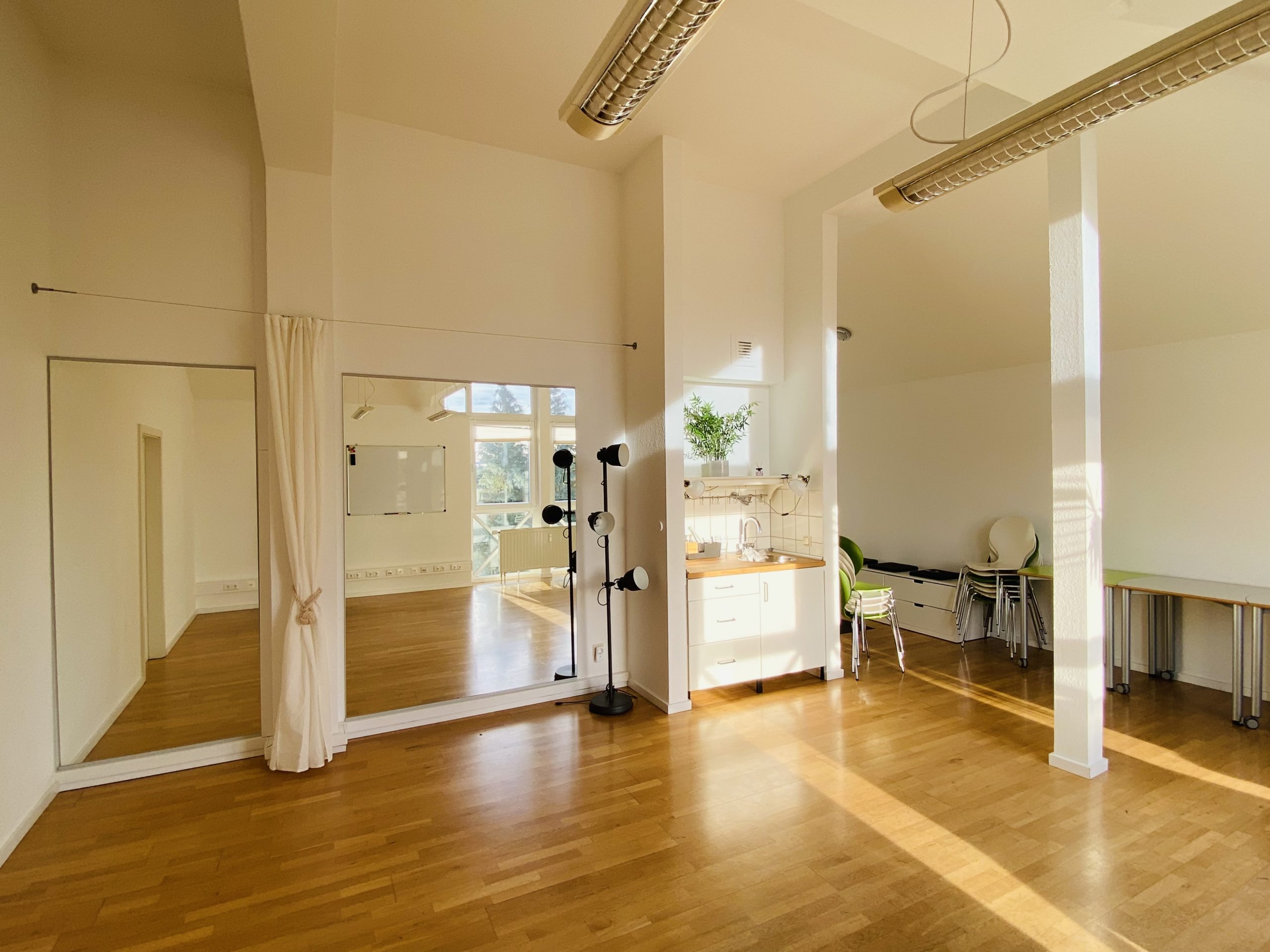 Die sehr zentral gelegenen Räume bieten auf ca. 45 qm und ca. 20 qm Platz für Spaß, Sport und Coaching. Miniküche und Badezimmer mit Dusche vorhanden.